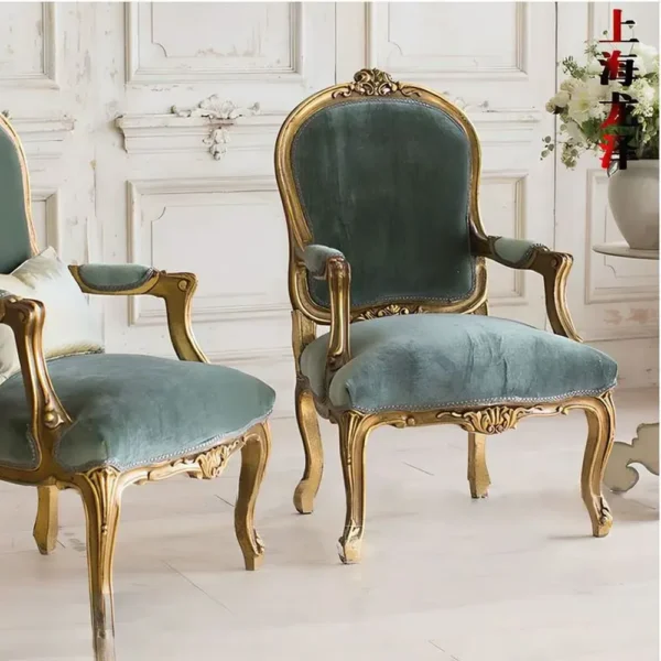 Luxury Green Velvet Carved Wood Bedroom Chairs with Gold Leaf Finish