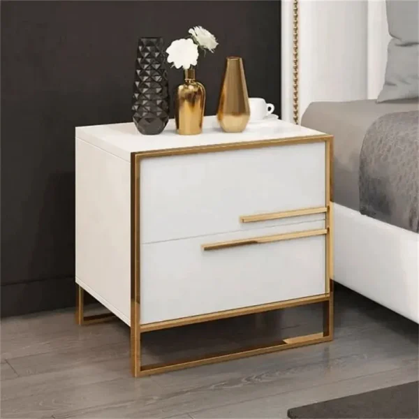 Experience a new level of comfort and style with our Geometric Metal Frame Luxury White and Gold Deco Side Table. This sophisticated side table combines a sleek white deco body with a striking gold metal base. The inset drawer handles maintain a seamless look, making it a perfect accent piece for high-end bedrooms. A perfect blend of form and function for the modern home.