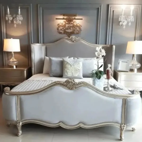 A masterpiece of refined design, this bed features a unique scalloped frame in silver and a central decorative crest. The smooth grey velvet provides a clean yet sophisticated look.