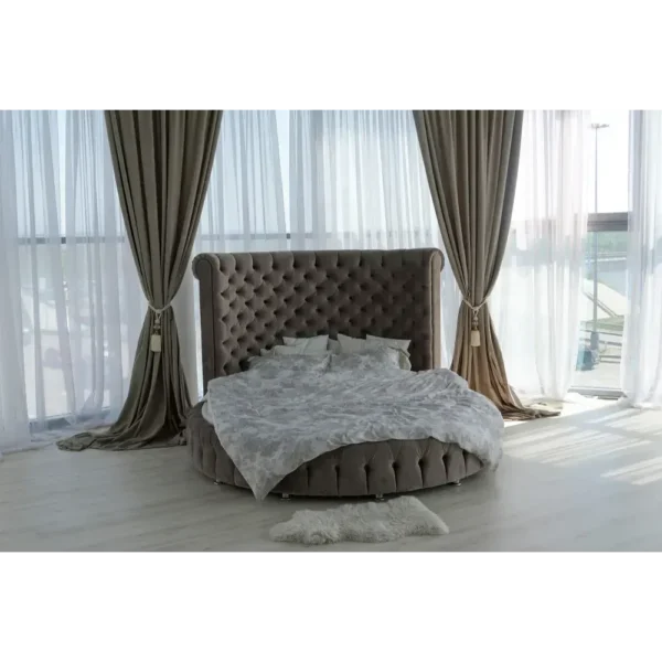 This commanding estate bed features an extra-tall, diamond-tufted headboard that serves as a stunning focal point. Upholstered in taupe velvet, the circular base provides a spacious and luxurious sleeping environment.