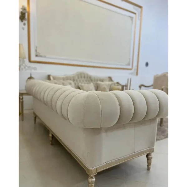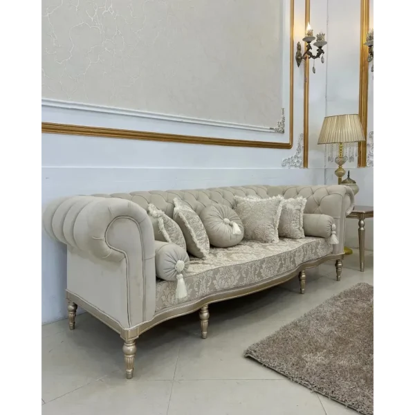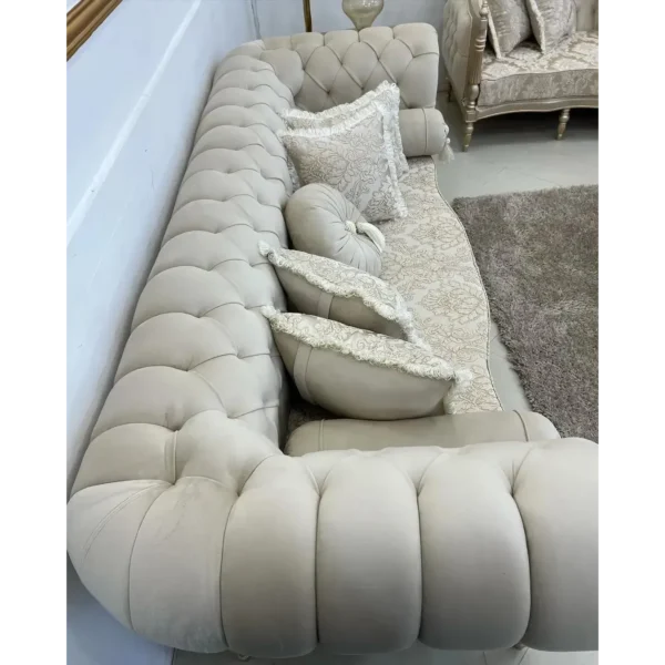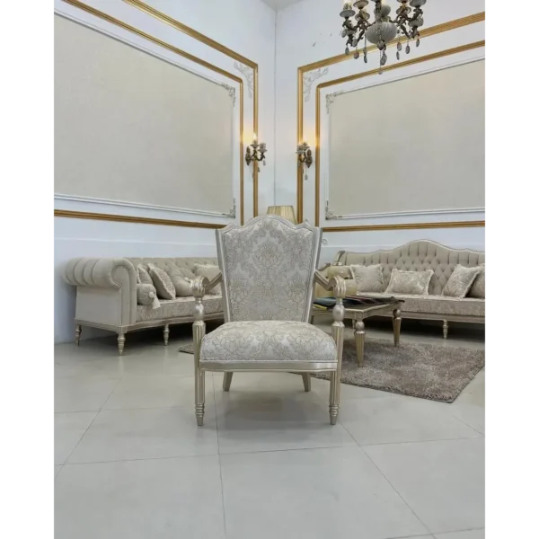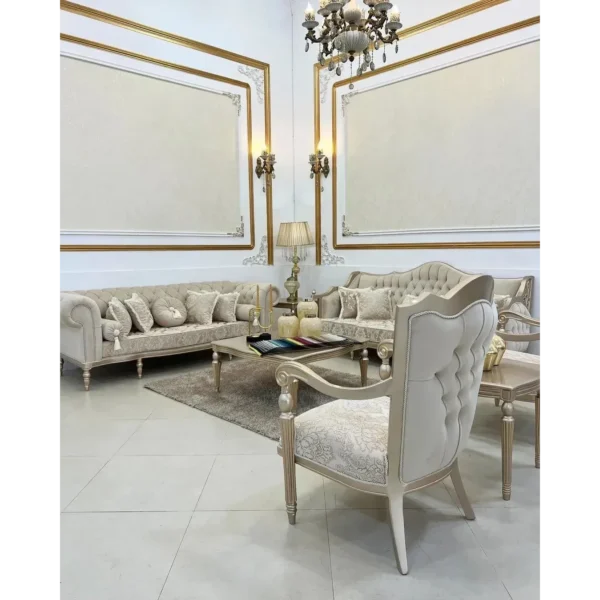 The Majestic sofa set defines luxury with its high-back tufted design and silver-polished woodwork. The soft ivory velvet is paired with orte silver accents, creating a bright and airy atmosphere of wealth.