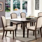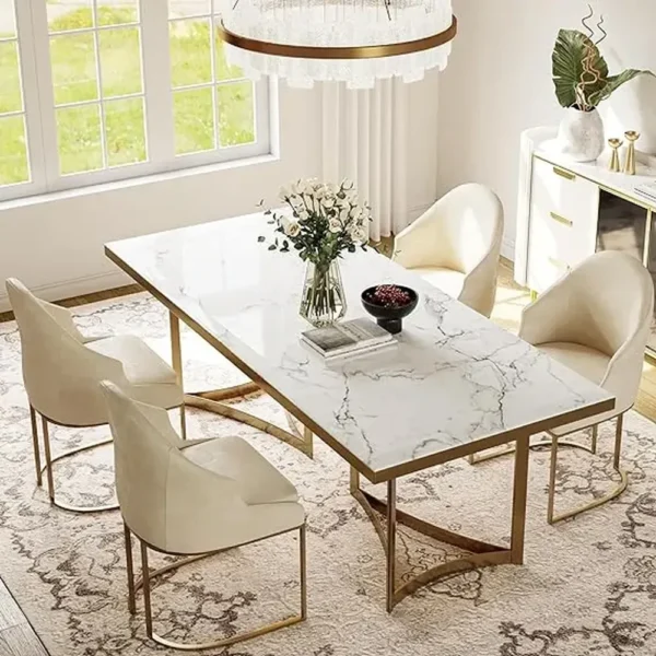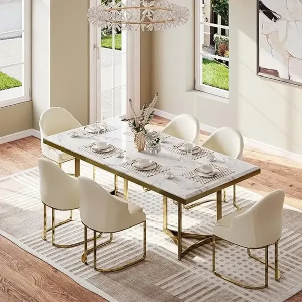 Brighten your dining area with the Marble Elegance Suite. A stunning white marble top is supported by a sculptural gold base, paired perfectly with six sleek white leather chairs for a clean, opulent look.