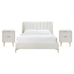 The Metropolitan bed offers an expansive, wrap-around headboard that creates an intimate and luxurious feel. Covered in warm beige boucle, it provides a high-end hotel aesthetic for your master suite.