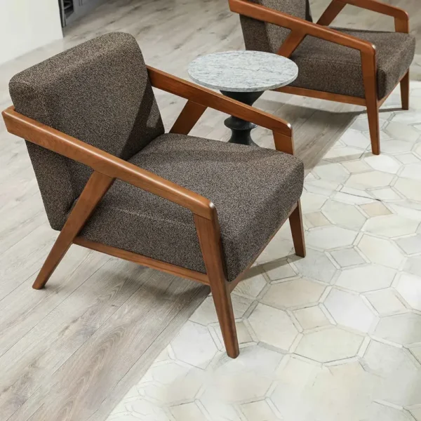 Experience a new level of comfort and style with our Mid-Century Chic Grey Jute Armchair with Brown Wooden Frame. These bedroom chairs blend geometric precision with cozy textures. The dark brown wooden frame provides a sturdy, angular silhouette that perfectly complements the grey jute cushions for a stylish, functiol seating solution. A perfect blend of form and function for the modern home.