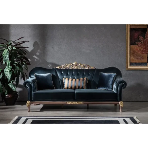 Make a bold statement with this midnight blue velvet sofa. The dark, rich fabric creates a stunning contrast against the polished gold wood carvings, perfect for a dramatic and luxurious interior.