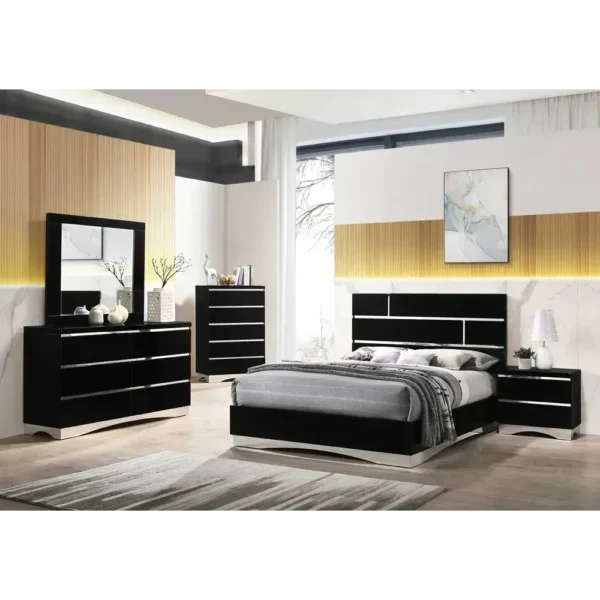 Bring contemporary drama to your room with this high-gloss black bedroom set. The headboard features a striking grid of silver inlays, creating a bold, geometric aesthetic.