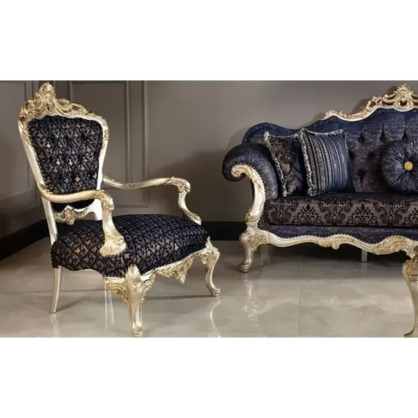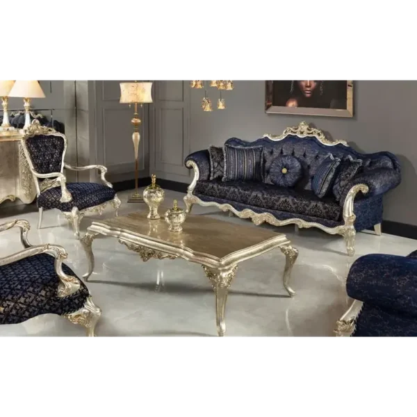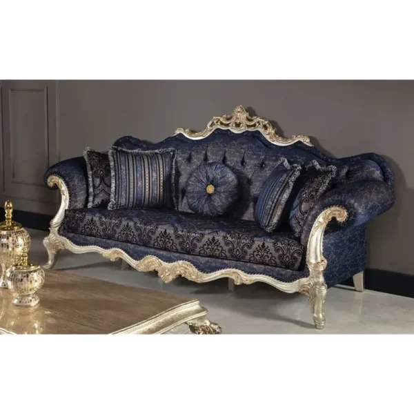 This majestic sofa features a deep sapphire blue velvet paired with stunning silver filigree carvings. The contrast between the dark fabric and the bright deco finish creates a striking, luxurious focal point.