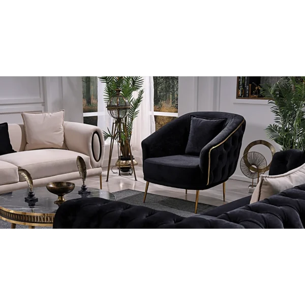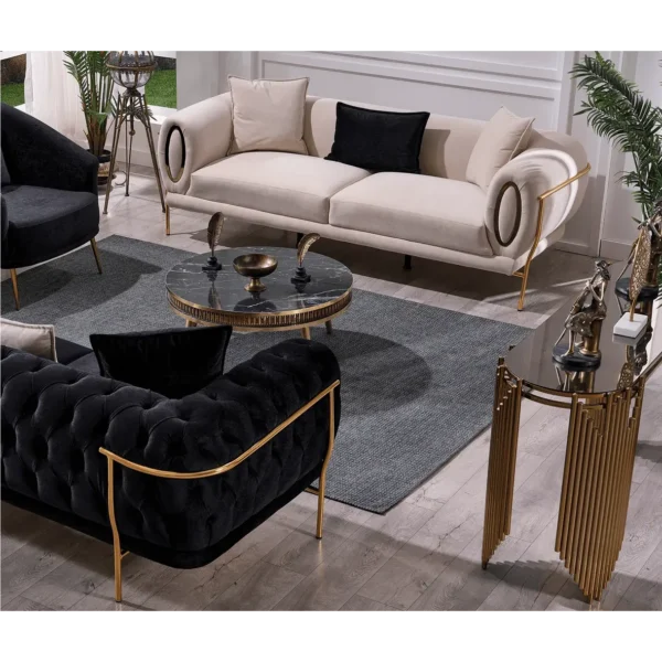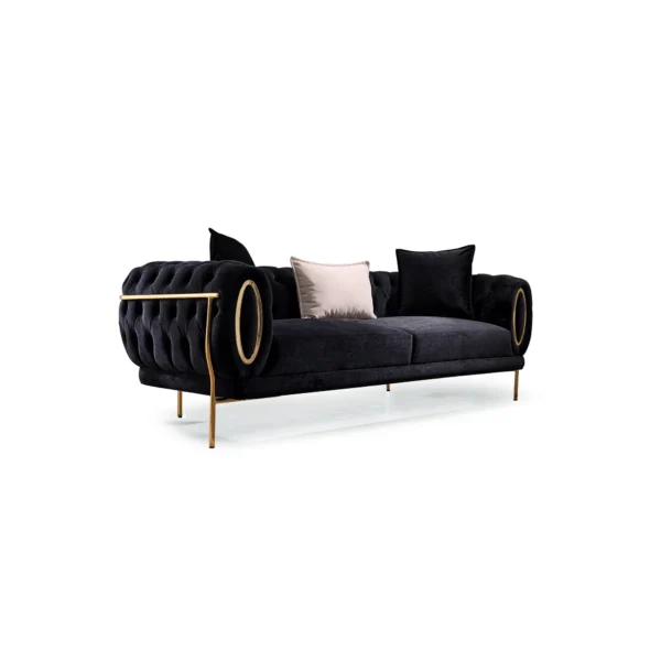 Elevate your living room with this Turkish-inspired velvet sofa. The striking combition of midnight black fabric and polished gold framing creates an atmosphere of high-end luxury and timeless sophistication.
