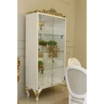 A simple yet refined display solution, this white showcase features tall glass doors and two lower drawers for concealed storage. The minimalist frame is elevated by chic gold-tipped legs, perfect for any dining or living room.