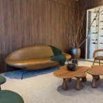 Featuring a gentle kidney-shaped curve, this mist grey velvet sofa offers a sophisticated silhouette. The light brown base adds a touch of warmth to the cool-toned, plush velvet fabric.