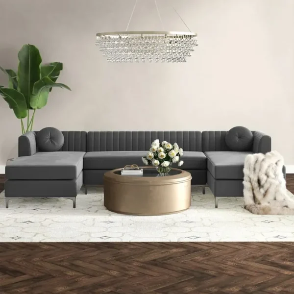 Experience a new level of comfort and style with our Chic Charcoal Grey Velvet U-Shaped Sectiol Sofa with Bolster Pillows. Experience the height of luxury with this sprawling U-shaped sectiol. Wrapped in premium charcoal velvet, the sofa features sophisticated vertical channel tufting and round bolster pillows. The slim silver metal legs add a touch of mid-century modern flair to this massive lounging piece. Built with quality materials to ensure lasting durability and style.