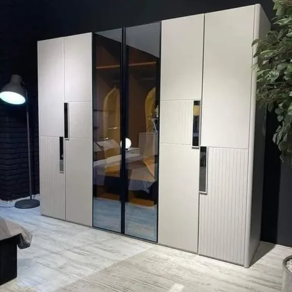 The Contemporary Deco High-Gloss White Wardrobe with Black Mirrored Center Doors is designed to bring a touch of class to any home. This large-scale storage solution offers a sleek, built-in look with high-contrast contemporary appeal.. Transform your dressing area with this striking modern cupboard. The outer doors feature a crisp white finish with vertical ribbed textures, while the central doors are clad in black tinted mirrors Built with quality materials to ensure lasting durability and style.
