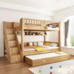 Modern Light Brown & Yellow Kids Bunk Bed with Integrated Storage Stairs