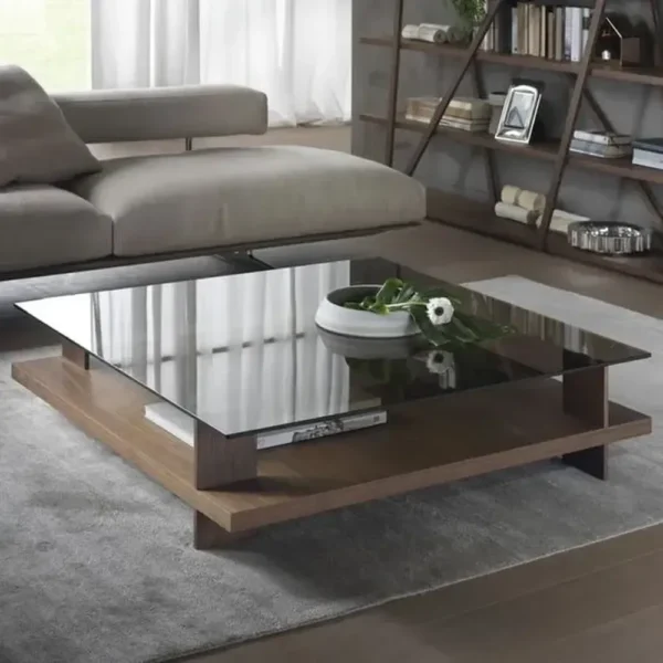 A masterpiece of minimalist design, this table features a large glass surface supported by a light brown wood frame. Its low-profile and open design keep your living space feeling light and airy.