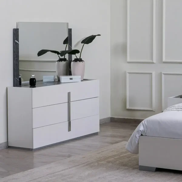 Transform your interior with the uniquely crafted Contemporary White Deco Bed with Integrated Marble Texture Headboard. This modern bed frame is a masterclass in clean aesthetics. The crisp white deco finish is elevated by a stunning dark marble-textured panel in the headboard, which features soft integrated lighting to create a warm, inviting ambiance in your master suite. An essential addition to your furniture collection.