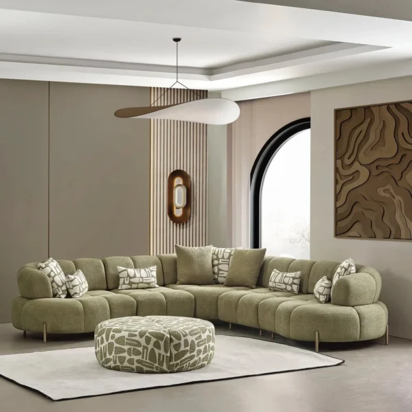 The Moss Grove stands out with its segmented “bubble” design and earthy green boucle fabric. This large sectiol offers ample seating and a playful yet luxurious silhouette supported by gold-accented legs.