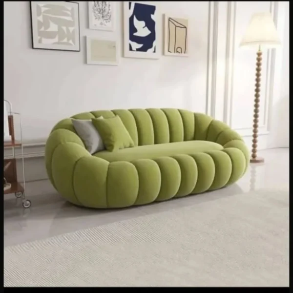 Wrap yourself in the comfort of the Moss Pod. This sofa features a distinctive “caterpillar” ribbed design in a trendy green velvet, offering a cozy, cocoon-like experience that serves as a focal point for any creative interior.