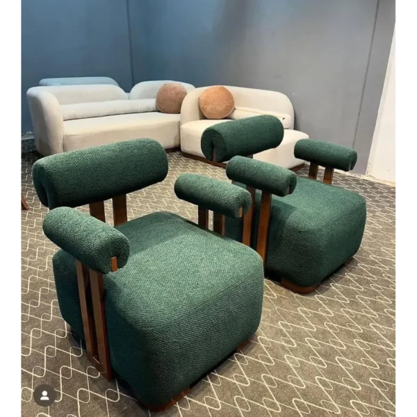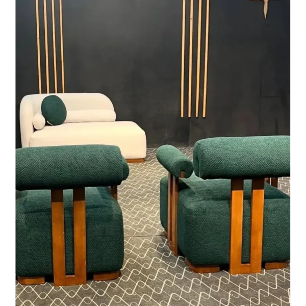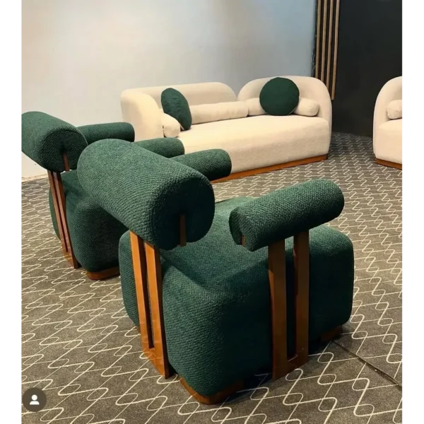 Experience the cozy warmth of boucle fabric with this modern arc-shaped sofa. The light brown polished wood supports provide a tural touch, while the forest green cushions offer a sophisticated pop of color.