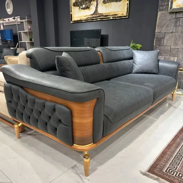 The Obsidian Luxe sofa is a bold statement piece, featuring deep charcoal velvet and intricate tufting on the side panels. Contrasting warm wood grain and gold-tipped legs create a high-contrast, premium look.