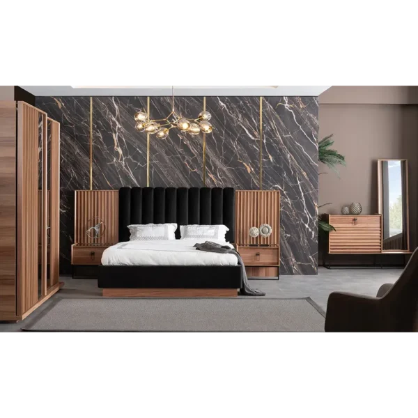 Obsidian Ribbed Velvet Luxury Bed with Marble Backdrop