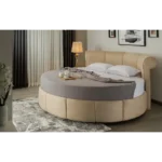 Inspired by organic shapes, this modern “Pebble” round bed offers a low-profile, minimalist aesthetic. The continuous curved frame is wrapped in smooth grey velvet, blending the lines between a luxury bed and a high-end lounge.