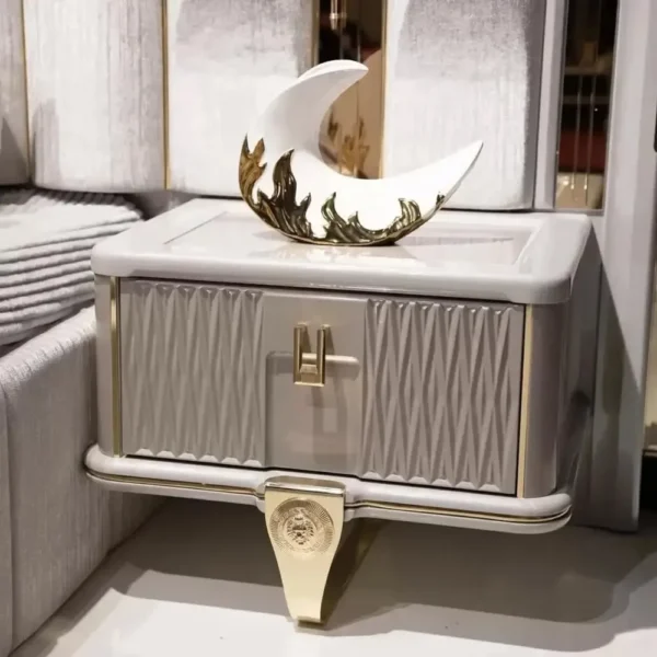 A complete luxury sanctuary, this set includes a vertically quilted grey velvet bed with gold trim, a matching six-door wardrobe, and a designer vanity station.