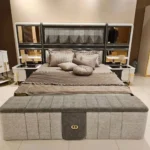 A complete luxury sanctuary, this set includes a vertically quilted grey velvet bed with gold trim, a matching six-door wardrobe, and a designer vanity station.