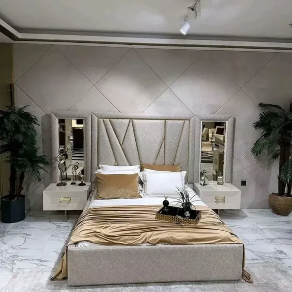 Premium Turkish Fabric Bed with Geometric Headboard & Mirrored Panels