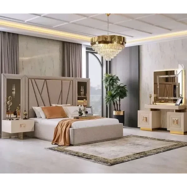 Experience a new level of style with the Premium Turkish Fabric Bed with Geometric Patterned Headboard and Mirrored Side Panels. This opulent fabric bed stands out with its intricate geometric patterned headboard. Flanked by tall mirrored panels and finished with gold-toned hardware, it brings a high-fashion look to any master suite. Ideal for those who appreciate fine craftsmanship.