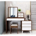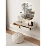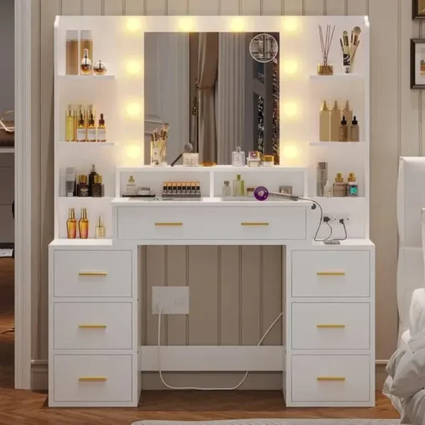 A dream for makeup enthusiasts, this large white vanity station provides studio-quality lighting and extensive storage. The gold handles add a touch of luxury to the modern white frame.