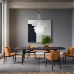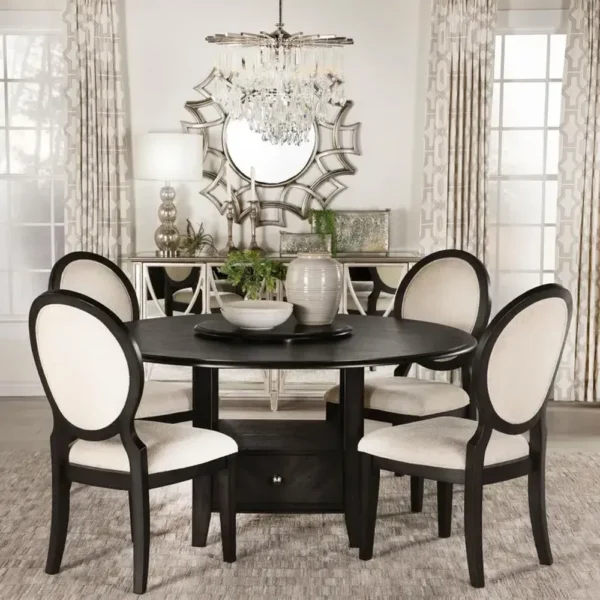 A sophisticated circular dining set ideal for intimate dinners. The dark brown wood is complemented by beige oval-back chairs, creating a timeless Regency-style atmosphere.