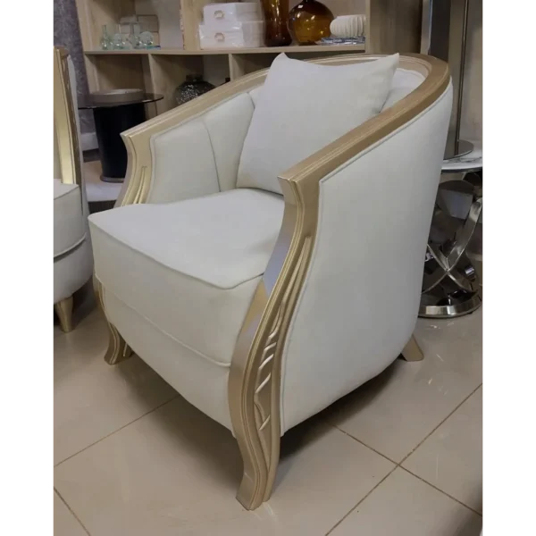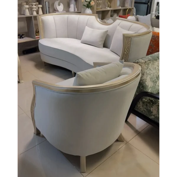 A masterpiece of Luxury Design, this white velvet sofa features a unique crescent curve. The frame is accented with shimmering gold deco highlights, making it the perfect centerpiece for a bright, high-fashion living room.