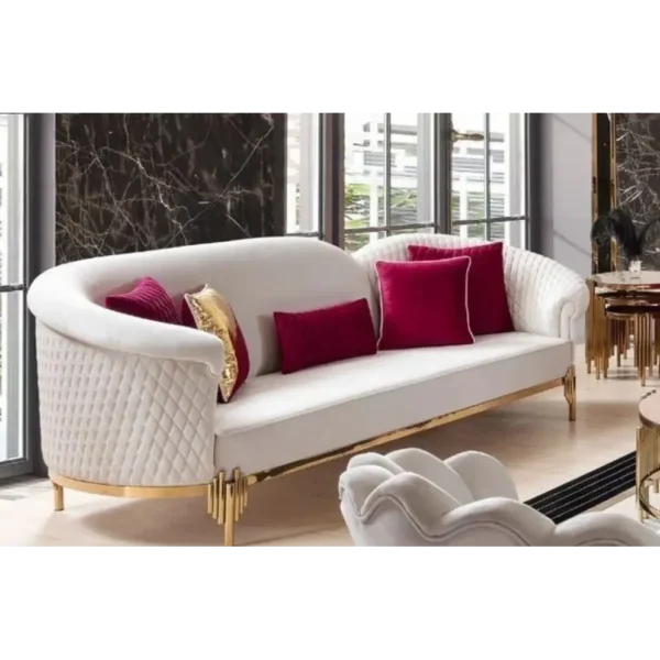 This show-stopping Turkish set blends a crisp white quilted exterior with deep crimson velvet seating. Accented with gold-toned metalwork, it brings a sense of palace-style grandeur to your formal sitting room.