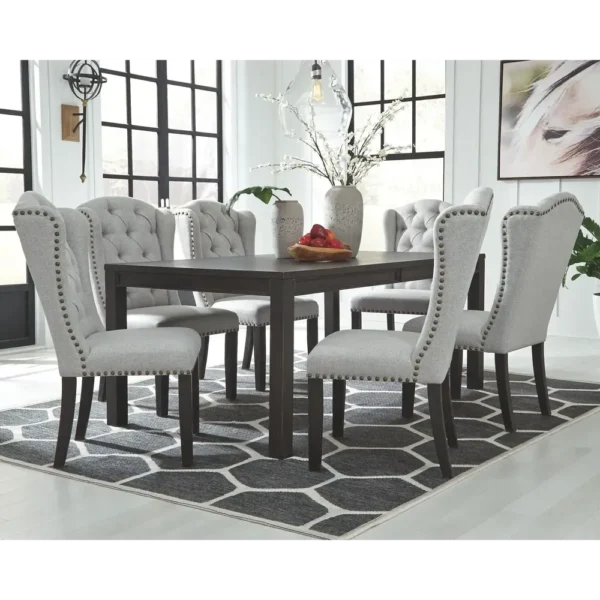 Command attention with the Royal Wingback set. These grand grey velvet chairs feature deep button tufting and elegant ilhead trim, paired with a substantial dark brown table that serves as the perfect anchor for formal dinners.