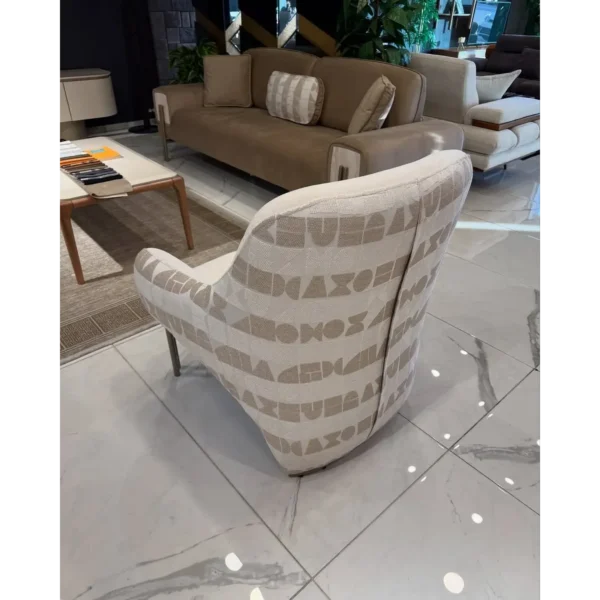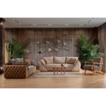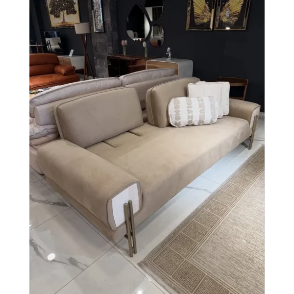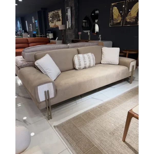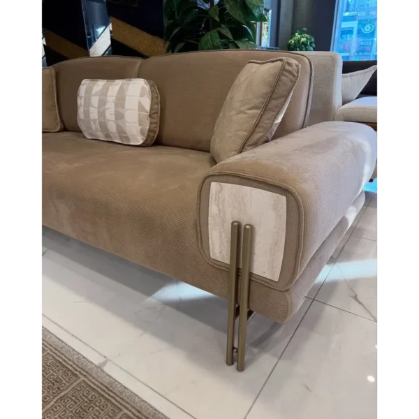 A contemporary masterpiece, this sofa features a sleek beige velvet body with unique stone-patterned insets on the arms. The slim metal legs provide a floating effect, perfect for a high-end minimalist apartment.
