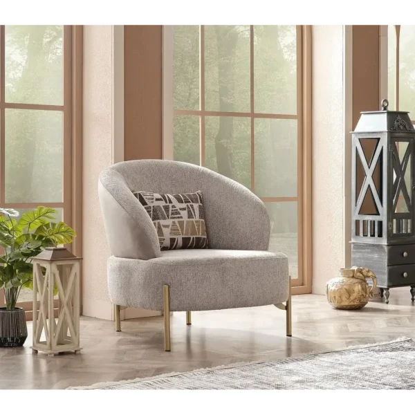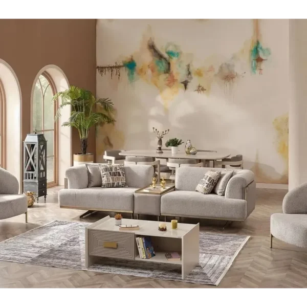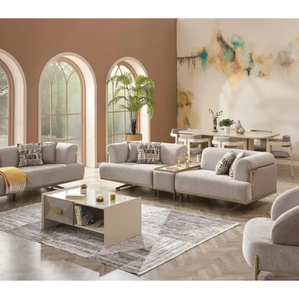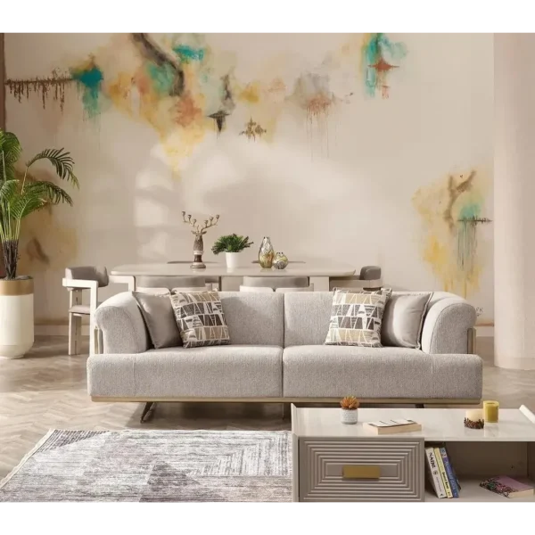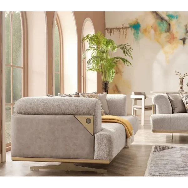 The Sahara sofa combines the cozy texture of beige boucle with the sharp, clean lines of modern architecture. The recessed gold base creates a floating effect, making it a sophisticated focal point for any room.