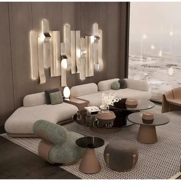 Embrace texture with the Sahara Sectiol. Wrapped in high-end beige boucle, its fluid, asymmetric shape breaks the mold of traditiol seating. Includes a functiol built-in wood tray for convenience.