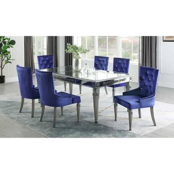 Make a statement with this high-glamour dining set. The reflective mirrored tabletop is perfectly balanced by the deep sapphire blue velvet chairs, creating a stunning focal point for modern homes.