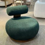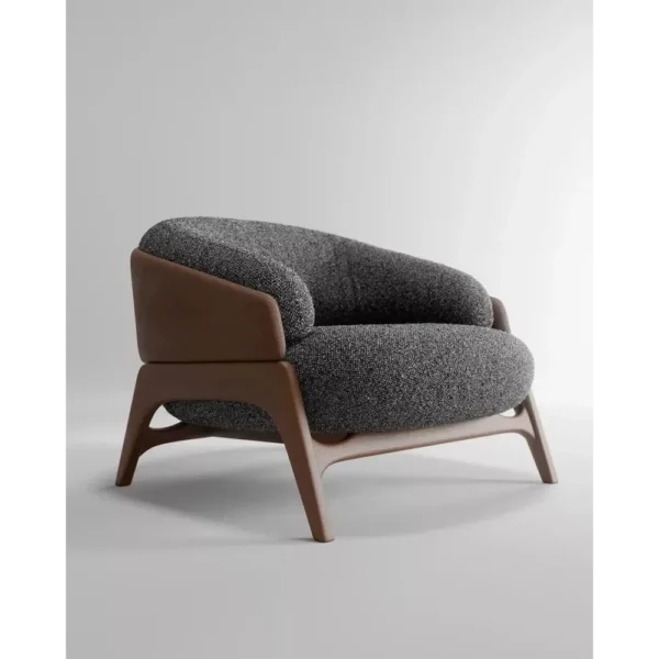 Merging texture and architecture, this lounge chair features a tactile black bouclé interior paired with a sleek leather-wrapped exterior. The light brown polished frame flows seamlessly into the legs, offering a sophisticated, high-end aesthetic.