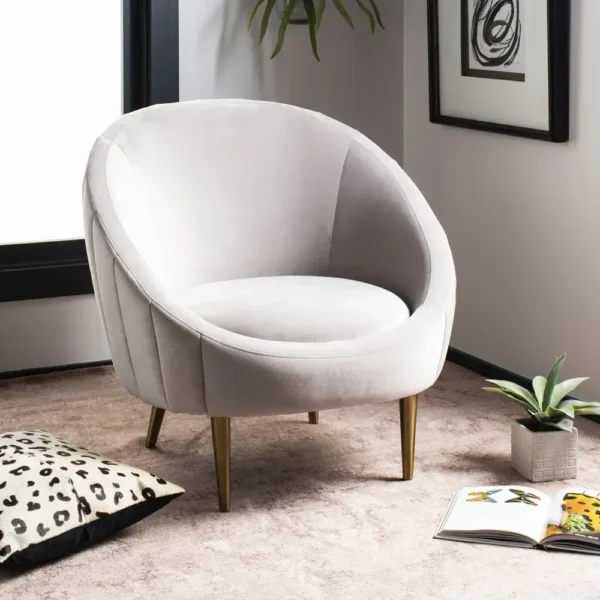 This elegant tub chair features a smooth, wrap-around backrest upholstered in premium beige velvet. The minimalist gold-toned legs provide a chic mid-century modern flair, making it a perfect accent piece for any contemporary bedroom or vanity.