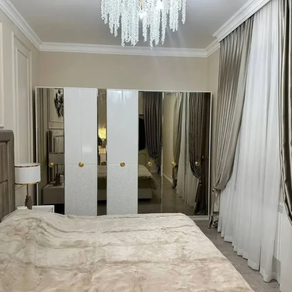 This Turkish-inspired bed set features a tall, velvet-upholstered headboard with a unique triangular stitch pattern, complemented by sleek white and gold bedside tables.
