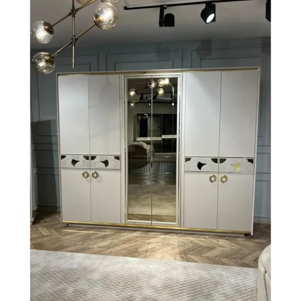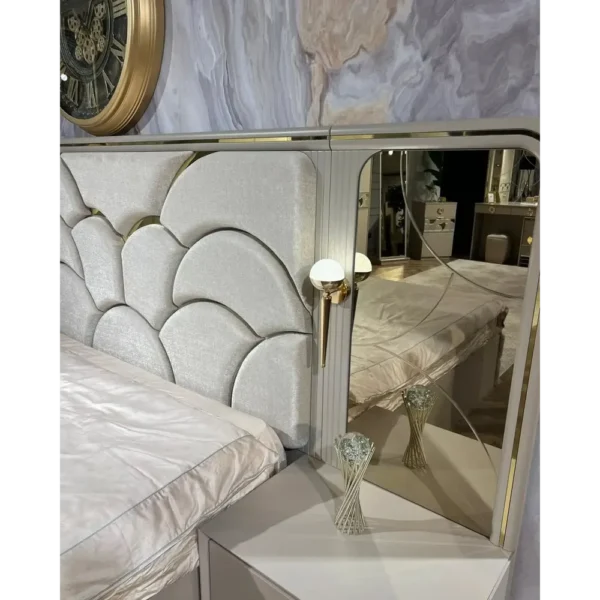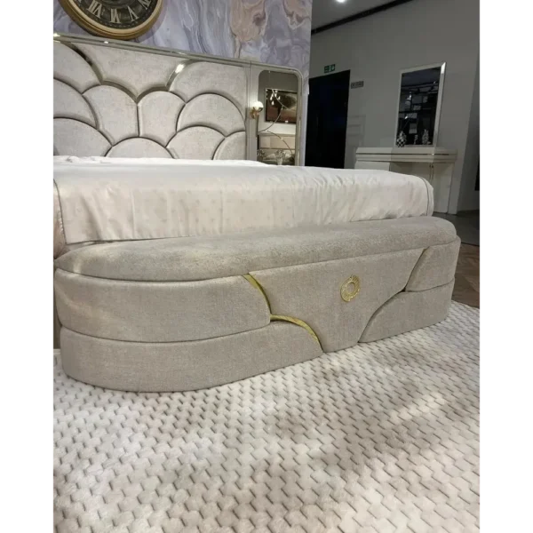 This Turkish-inspired Deco bed features a stunning scalloped headboard with gold metallic trim. Upholstered in premium white velvet, it includes a matching curved footboard bench for ultimate bedroom luxury.