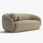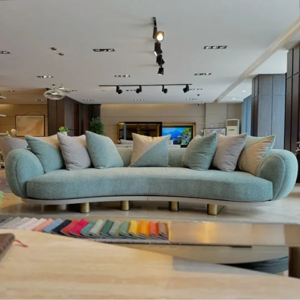 This stunning serpentine sofa features a unique curved silhouette upholstered in premium green boucle. Supported by polished gold cylindrical legs, it blends organic shapes with mid-century modern luxury.