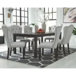 The Silhouette set celebrates mid-century curves and functiol design. Featuring a warm brown wood polish, the set includes a streamlined table, a padded bench, and four grey fabric chairs designed for ergonomic support and style.