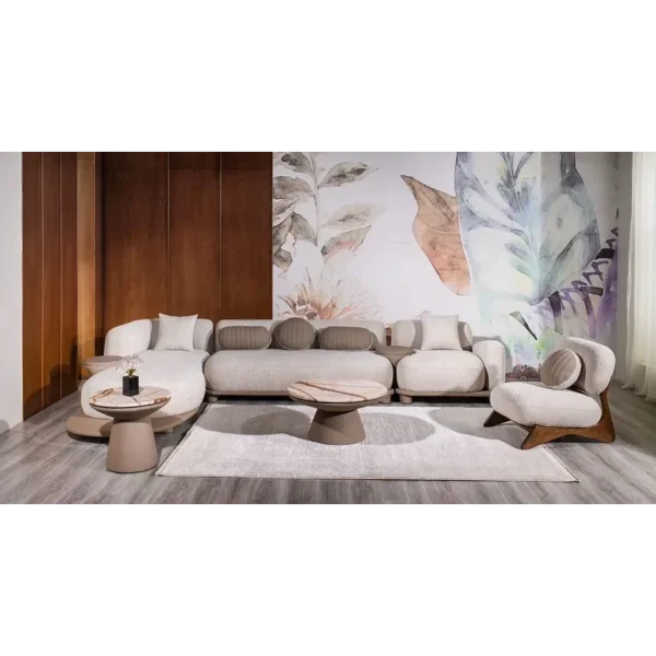 This sophisticated lounge set combines an L-shaped modular sofa with a matching sculptural accent chair. Featuring off-white velvet and unique circular cushions, it sits on a subtle polished wood base for a refined look.