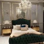This stunning teal velvet bed set features a dramatic scalloped headboard and a matching tufted bench. The gold-toned frame adds a warm, opulent touch to any master suite.