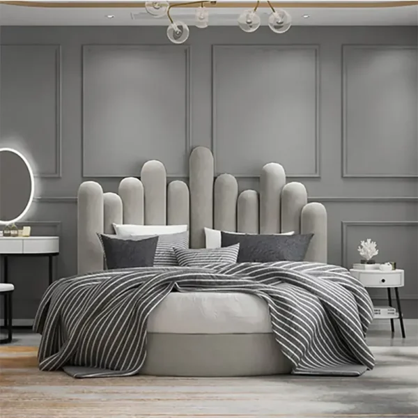 Make a bold statement with this modern round bed featuring a unique “finger” style headboard of varying heights. Wrapped in premium grey velvet, it offers a skyline silhouette that adds architectural interest to any contemporary bedroom.