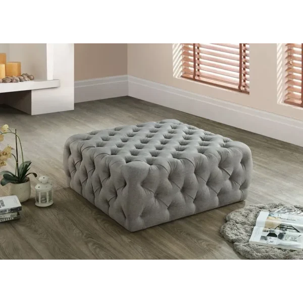 This expansive square pouffe is upholstered in premium slate grey velvet with intricate button tufting across the entire surface. Its large scale makes it ideal as a central coffee table altertive or luxury floor seating.