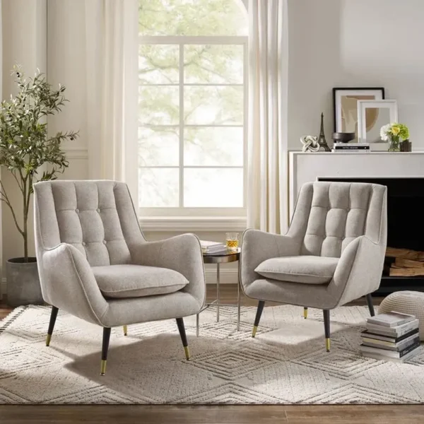 These sophisticated grey armchairs feature classic button tufting and a gentle wingback silhouette. The black legs are finished with polished brass tips, adding a high-end mid-century modern look to your master suite.