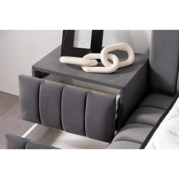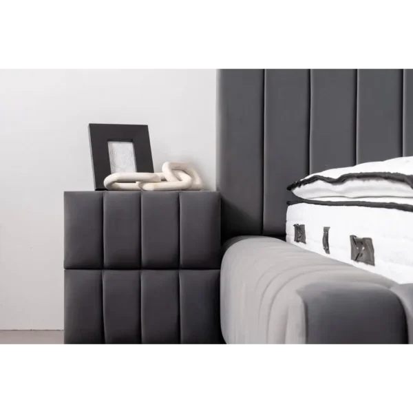 Designed for the lover of clean lines, this simple fabric bed features a wrap-around ribbed texture in a sophisticated slate grey. The integrated matching nightstands and low-profile design create an uninterrupted, zen-like atmosphere in any modern home.